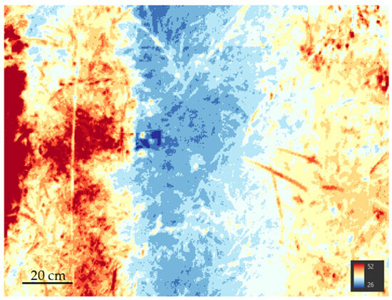 While the multispectral camera acquires single images, the thermal camera records a video, from which single frames can be extracted to be processed in a photogrammetric workflow. An example of this output frame is shown in Figure 6, where lower values are indicated by blue shades (i.e., minimum temperature of 26 °C), while higher values are indicated by red shades (i.e., maximum temperature of 52 °C).
