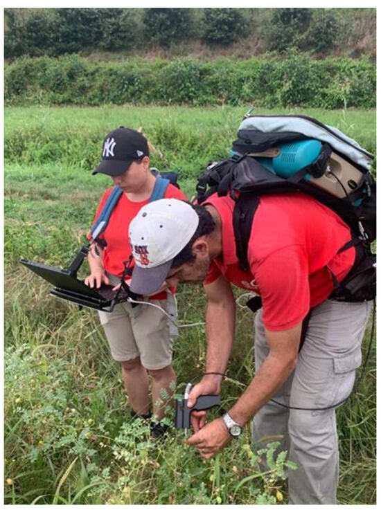 The multispectral and thermographic surveys were carried out during the reproductive stage of chickpea: the first one on 14 July 2023, corresponding to the early beginning of seed formation (i.e., when a fully expanded green pod was present and seed cotyledon growth was visible); the second one on 4 August 2023, corresponding to the first stage of plant maturity (i.e., when the first pods reach maturity and thus become dry, turning into a light-yellow color), approximately three weeks before harvesting (i.e., when ~90% of pods reach maturity) (Figure 3). This approach was chosen given that both techniques allowed for efficient phenotyping in different legume crops and have been used for detecting changes in plant status, which are not visible to the naked eye [12,14,16]. The multispectral survey was conducted using a rod armed at its end with a ParrotTM Sequoia sensor (four bands within the spectral range from 0.55 to 0.79 µm) equipped with a 16 MP camera (Figure 4).