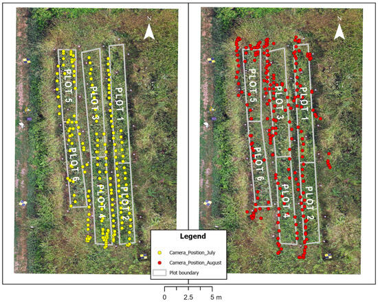 Location of the image acquisition perspective centers as acquired during the multispectral-thermal surveys of July and August 2023. The image in the background is an orthophoto that was acquired during the August 2023 survey by a drone photogrammetric flight.