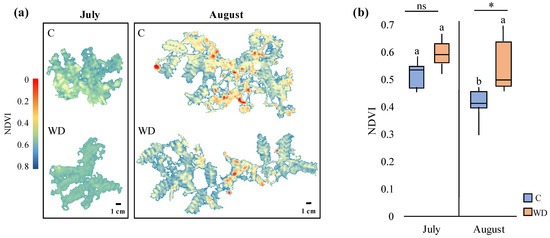 (a) Generated NDVI images from the most representative control (C) and WD-treated (WD) plants in July and August and (b) associated average NDVI scores (median ± error). Different letters indicate statistically significant differences between the same treatment in July and August, while asterisks (*) indicate statistically significant differences (p < 0.05) between C and WD-treated plants in July and in August; ns: not significant.