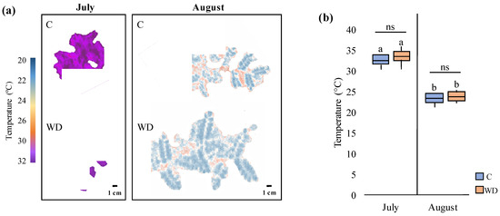 Thermal analyses of control (C) and WD-treated (WD) chickpea plants in both July and August survey campaigns. (a) Thermal images of the most representative C and WD-treated plants in July and August and (b) associated temperature average values (median ± error). Different letters indicate statistically significant differences between the same treatment in July and August; ns: not significant.