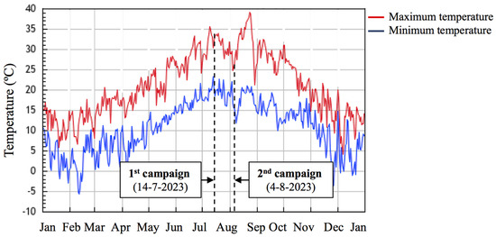Minimum (blue line) and maximum (red line) temperatures in Buti in 2023. Dotted lines indicate the dates of the spectral, termographic and spectroradiometric campaigns carried out (data retrieved from [27].