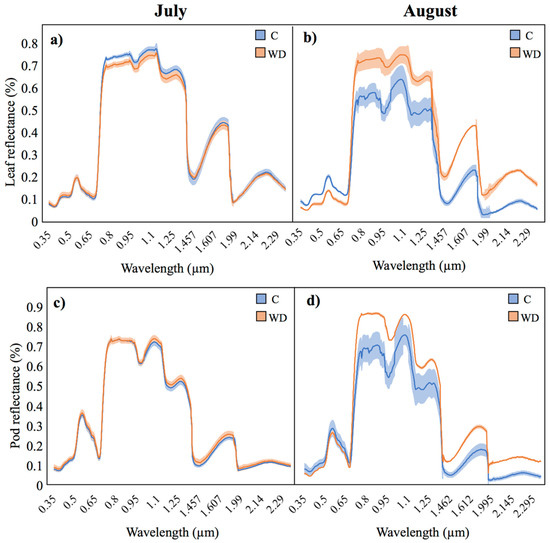 Mean reflectance values (lines) and associated standard error (shades) from control (C) and WD-treated chickpea leaves and pods in the two survey campaigns: (a) leaves in July; (b) leaves in August; (c) pods in July; (d) pods in August.