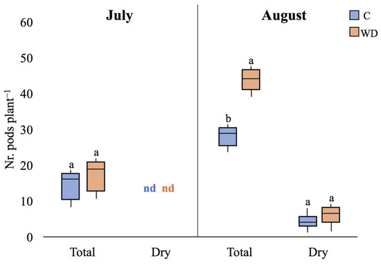 Total number of pods and number of dry pods, (median plant-1 ± error) of control (C) and WD-treated (WD) plants in both July and August campaigns. For each parameter, different letters indicate statistically significant (p < 0.05) differences between treatments. ns: not significant; nd: not determined.