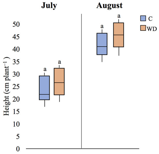 Plant height (median plant-1 ± error) of control (C) and WD-treated (WD) plants in both July and August campaigns. For each parameter, different letters indicate statistically significant (p < 0.05) differences between treatments.