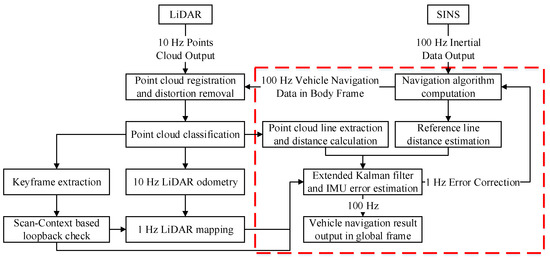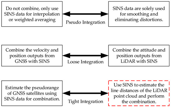 As illustrated in Figure 2, the concept of loose integration in LiDAR/SINS systems can be redefined from the GNSS/SINS loose integration navigation system. This approach involves combining position and other navigation data obtained from different sensors. In this process, none of the sensors involved in the integration have undergone in-depth data integration, but only a simple integration of the navigation results. By applying this redefined concept of loose integration, it becomes evident that studies such as [17,18], while claiming to employ tight integration, actually align more closely with the characteristics of loose integration. Specifically, these studies treat the individual systems as black boxes, focusing solely on integrating their outputs to generate the final navigation solution rather than performing in-depth data extraction and analysis.