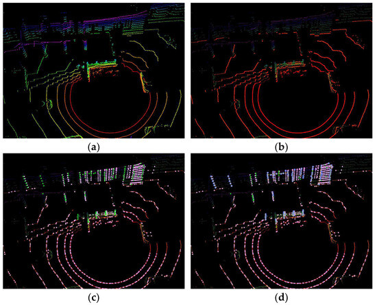 Feature extraction process for a scan in noisy environment. The original point cloud is shown in (a). (b) The red points are labeled as ground points. The rest of the points are the points that remain after segmentation. This method will be shown in Section 2.2.1. (c) Green and pink points indicate edge and planar features, which are mentioned in Section 2.2.2. (d) The blue points represent edge line points. The specific extraction method is explained in Section 2.2.3.