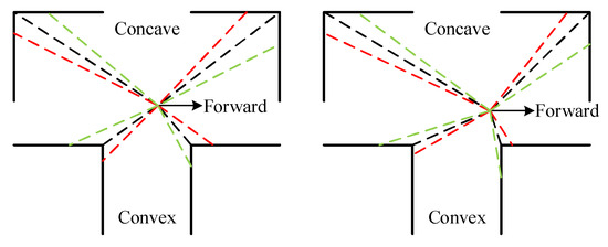 Following the extraction of feature points, another attribute will be computed, specifically, the concavity or convexity of the edge points. Figure 6 shows the difference between the concave points and convex points. Compare the distances between a specific point and the remaining points within set . If the majority of these points have distances greater than that of , then is considered a convex point. Otherwise, it is a concave point.