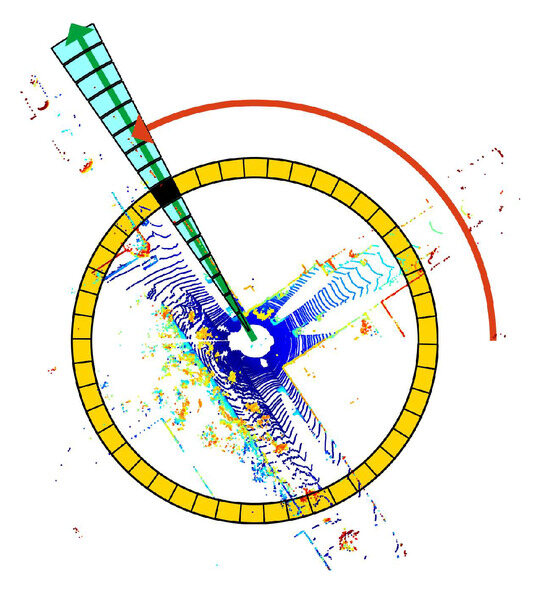 Figure 7 shows the bin division along azimuthal and radial directions. Using the top view of a point cloud from a 3D scan, the paper [10] partitioned ground areas into bins, which were split according to both azimuthal (from 0 to 2π within a LiDAR frame) and radial (from center to maximum sensing range) directions. They referred to the yellow area as a ring, the cyan area as a sector, and the black-filled area as a bin.