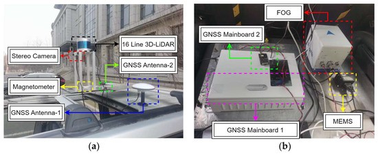 The experimental hardware: (a) shows the 3D LiDAR and GNSS antenna while (b) shows the GNSS processing, fiber optic gyroscope, and MEMS.