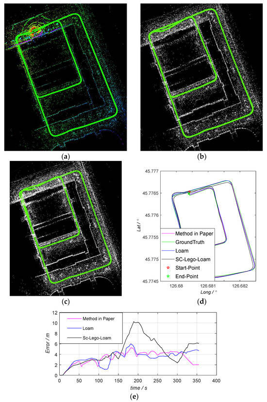 In conventional scenarios, the performance of the algorithm proposed herein was comparable to that of LOAM. However, in scenarios where structural features were sparse or lacking, the algorithm demonstrated superior performance. The experimental results indicate that, while the algorithm achieved results similar to LOAM under typical conditions, it excelled in environments with limited structural features. In experiments that satisfied loop closure conditions, its relative advantage was even more pronounced. The relative accuracy improved by approximately 17%. From Figure 12, it can be observed that, in a general scenario, although the algorithm in the paper achieved good results, its basic performance was consistent with the other two algorithms. This scenario was only to verify the universal applicability of the algorithm in the paper, so there was no significant improvement in the specific comparative data. Figure 13 (DATA_2) is a preset scenario for the paper. Excluding the SC-Lego-LOAM algorithm, which was eliminated due to loop closure failure, from the error in Figure 13e, it can be seen that, after entering the parking lot environment, the error of the LOAM algorithm began to gradually increase, while the algorithm in the paper maintained a stable trajectory tracking. This fully demonstrated that the algorithm proposed in the paper achieved optimization for special scenarios while maintaining universality.