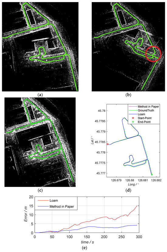 The result of LiDAR SLAM in Data_0405: (a) was built by the LOAM; (b) was built by SC-Lego-LOAM; (c) shows the mapping result of the method from this paper; (d) depicts a direct comparison between various algorithms; (e) represents the positioning errors of the algorithms measured in meters.