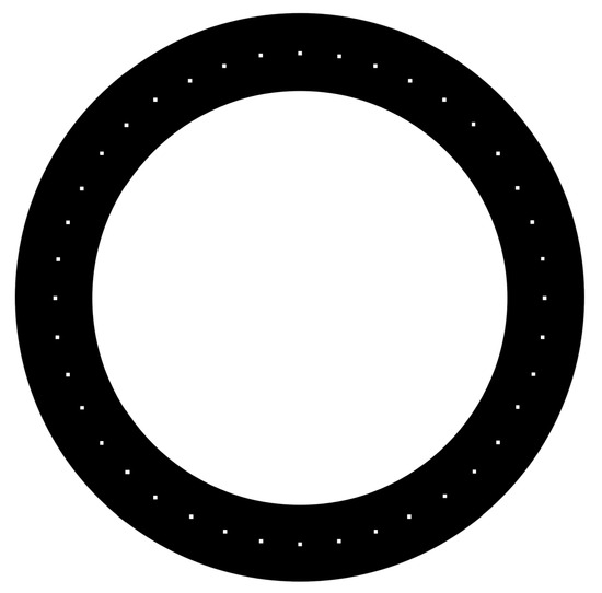 The watermark to be embedded consists of a binary sequence of 0s and 1s, with a length denoted as . The watermark is represented as . A ring-shaped template watermark is constructed using the magnitude coefficients in the DFT domain. Figure 2 shows a schematic diagram of the template watermark, where black represents a DFT magnitude of 0, and white points represent non-zero magnitudes, indicating watermark bits of 1. The watermark information is evenly distributed within the ring. Due to the central symmetry of the magnitude spectrum, the calculation formula for the interval denoted as between two watermark bits is as follows: