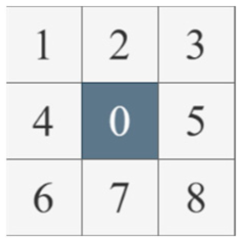 Multiscale LCM was proposed in the literature [26]. LCM, local contrast measure, is an effective contrast measurement method inspired by biological vision mechanisms, capable of enhancing targets while suppressing the background, thus effectively extracting small objects. A 3 × 3 window of an image, where each grid in the window may represent more than one pixel, is shown in Figure 4, with each grid numbered 0–8. For this window, first, calculate the maximum pixel value in area 0. Then, calculate the average grayscale value for each area in the window. The local contrast is calculated as shown in the following equation: