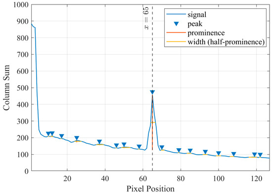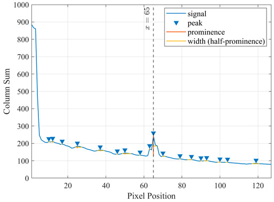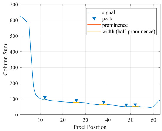 The warped contrast map is summed column-wise to obtain a one-dimensional sequence. The pixel position of the maximum prominence in this sequence can be found. The vertical stripe from the previous step is crucial for this process. In the remapping result, the position of the center of the template watermark is 1. Subtracting one from the position of the maximum prominence gives the radius of the template watermark, denoted as . As shown in Figure 7, the maximum prominence occurs at position 65, so equals 64, which matches the radius value used during embedding.
