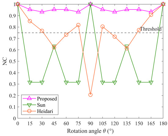 Figure 13 shows the results of rotation attacks. The NC values are used to evaluate the performance of the proposed method, Method Sun, and Method Heidari under various rotation angles. The rotation angle ranges from 15° to 180°, in intervals of 15°.