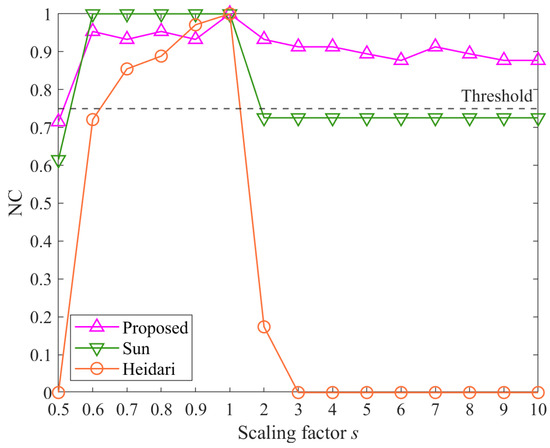 The NC values of the proposed algorithm remain consistently high across most scaling factors, demonstrating strong robustness against scaling attacks. The NC value stays above 0.87 for all tested scaling factors except when , indicating a high level of correlation between the extracted watermark and the original watermark. When , the NC value of the proposed method drops below the threshold of 0.75. However, it is consistent with the theoretical analysis in Section 2.1.1.