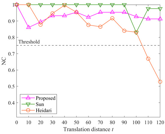 Overall, while Method Sun generally achieves higher NC values across all tested distances, the proposed method performs well against translation attacks, consistently achieving NC values above the threshold. Method Heidari performs adequately but shows more variability in its NC values than the other methods.