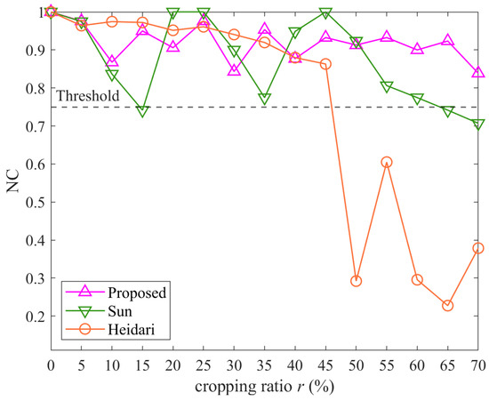 Method Sun generally demonstrates strong robustness against cropping attacks, maintaining NC values above the threshold of 0.75 for most cropping ratios. However, the NC values fluctuate more compared to the proposed method, with significant drops at specific points, such as 15% and 35%. Method Heidari shows the most significant variation, with NC values gradually declining and then dropping below the threshold at cropping ratios above 45%, indicating higher susceptibility to cropping attacks compared to both the proposed method and Method Sun.