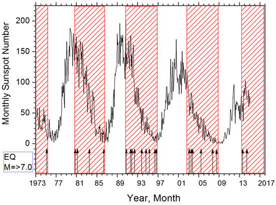 It is assumed, at present, that, during the 11-year solar cycle, two maxima in geomagnetic storm numbers appear—one in the sunspot maximum, when coronal mass ejection (CME) is mainly responsible for the geomagnetic activity, and another one in the descending phase of the 11-year solar cycle, when the high-speed solar wind (HSSW) from the polar coronal holes is mainly responsible for geomagnetic activity [22]. The authors of [23] studied the day-to-day variations in the number of earthquakes relative to the days when the Earth was exposed to the CMEs and when the Earth was exposed to the HSSW in 1973–2000. They revealed that, in the 11-year solar cycle, two maxima in the number of earthquakes appear—one in the sunspot maximum and another one in the descending phase of the solar cycle. As for the association of strong (M ≥ 7.0) earthquakes with the descending phase of solar activity in the 11-year solar cycle, Reference [24] (p. 18–19, Figures 10 and 11 and Table 1) systematized the results, showing that this effect was most pronounced for those earthquakes that occurred at the footprint of geomagnetic lines L = 2.0–2.2 in the Earth’s crust (Figure 1).