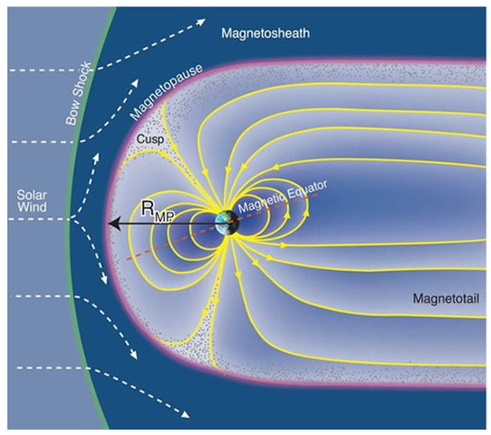 In the magnetosphere, there are two places where the solar wind-charged particles can fill the geomagnetic lines; these are the areas of the northern and southern polar cusps. In Figure 2, the Earth’s magnetosphere with two polar cusps is schematically presented. The boundary that separates the solar wind area, known as a magnetosheath, from the magnetosphere is called the magnetopause (outer boundary of the Earth’s magnetic field). Solar wind energy enters from the magnetosheath to the magnetosphere due to a process of magnetic reconnection [28]. When magnetic reconnection occurs at the magnetopause, the solar wind particles from the magnetosheath move continuously along the opened geomagnetic lines into the cusp and magnetotail [29]. The cusps (yellow dots in Figure 2), first observed by [30,31], are the magnetosphere regions filled with the denser plasma. The cusp is a funnel-shaped region in which, from a magnetic field point of view, the compressed high-latitude dayside geomagnetic field lines and the elongated nightside geomagnetic field lines converge toward the geomagnetic poles [32]. It was noted in [33] that the cusp is a versatile and very compact area for study, because all geomagnetic lines reaching the magnetopause converge into the cusp region. Consequently, all processes on the magnetopause, including magnetic reconnection, leave their signatures in the precipitating charged particle profile.