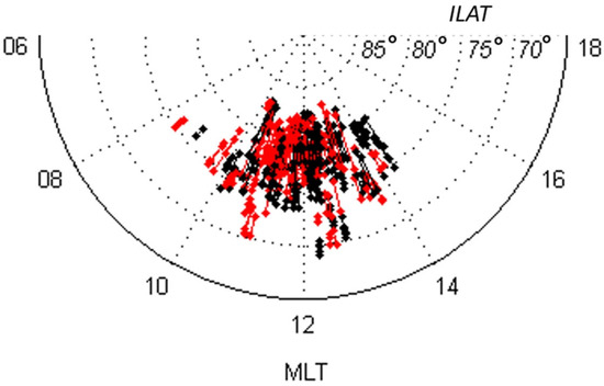 Figure 3, reprinted from [35], shows that, most of the time, the cusp is located at invariant magnetic latitudes 75°–80° and in a longitudinal region of 10 h–14 h magnetic local time (MLT). However, sometimes, its longitudinal extension may be more comprehensive, depending, for example, on the reconnection X-line length [36]. Also, it was noticed in [32] that the Cluster satellites, which data are presented in Figure 3, due to the geometry of their orbits, do not allow to determine the entire longitudinal extent of the cusp correctly, and to do so, the spacecrafts should have been placed in more or less parallel orbits, so that they fly at the same latitude, though at different longitudes or local times, which could be realized in subsequent magnetosphere missions. As shown in [37], using data from the satellite Polar, the polar cusp may be between 08 h and 16 h MLT.