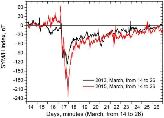 Figure 4 presents the 1-min data of the SYM/H index from March 14 to March 26 in 2013 (black) and 2015 (red) from the OMNI database. It is seen that the storm of March 2015 was more substantial in comparison with the storm of 2013, which resulted evidently from different types of solar flares that generated these storms (C1.6 and C9, respectively). It is seen in Figure 4 that the shape and the duration of the main storm phase and the recovery phase were somewhat similar.