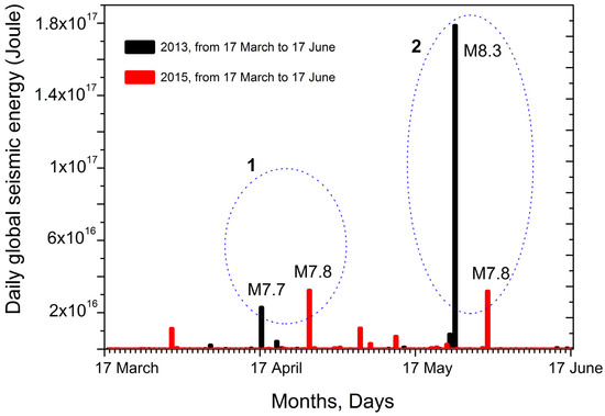 In Figure 5, the dashed circles (1 and 2) mark the most significant peaks in the globally released seismic energy after 17 March 2013, and 17 March 2015. For both years, the first peak occurred in April and the second in May. Table 1 presents earthquake data, which are mainly responsible for forming the Es peaks marked as 1 and 2.