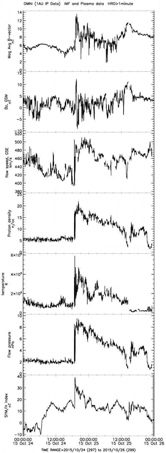 These two geomagnetic storms have been analyzed in many papers [39,40,41,42] (and references herein) and discussed at many conference sessions. In a unique collection of Journal Geophysical Research (June 2017, Issue 6), there are more than 30 papers by researchers worldwide investigating the storm–time geospace behavior during the St. Patrick’s Day geomagnetic storms of 2013 and 2015. Since these events, especially the storm of 2015, were the strongest in the 24th solar cycle, they are considered a good event for checking the current theories and concepts [39].