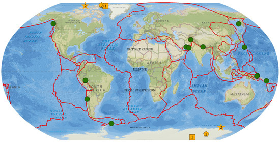 In Figure 8, we show the aspatial distributions of 14 epicenters of (M ≥ 7.5) earthquakes (from Table 2) that occurred around the globe in 2013 and 2015 (circles); color symbols with digits in the Northern and Southern Hemispheres show the locations of the magnetic poles for the epochs of 1975–2015 for three options: 1—geomagnetic poles, 79.5°N, 71.4°W and 79.5°S, 108.6°E; 2—magnetic dipoles 80.3°N, 114.9°W and 64.9°S, 138.4°E; 3—corrected geomagnetic poles 81.46°N, 82.33°W and 74.18°S, 126.19°E.