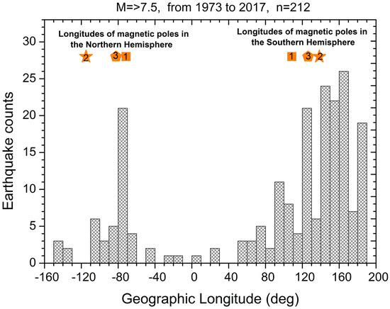 To confirm once more the reality that the longitudinal regions of the occurrence of strong earthquakes are confined to the longitudes of the magnetic pole locations, we present in Figure 9 the histogram of the distribution of the number of (M ≥ 7.5) earthquakes that occurred around the globe in 1973–2017 (212 events) dependent on the longitude. Here, blue quadrants, red circles, and purple triangles mark the longitudes of the magnetic poles’ locations in the Northern and Southern Hemispheres, respectively, as discussed above. It can be seen in Figure 9 that, around the globe, the longitudinal regions of the strongest earthquake occurrences are centered around the longitudes of the magnetic poles’ locations.