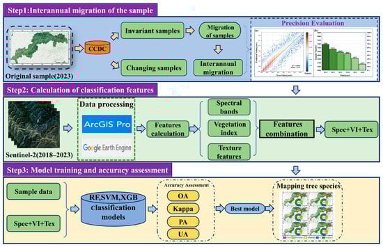 The workflow for conducting the task of mapping dominant tree species in the study area consisted of the following steps (Figure 3): (1) inter-annual migration of samples, (2) computation of taxonomic features, and (3) training and accuracy assessment of classification models.