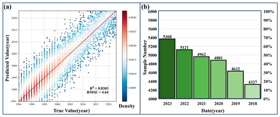 Accuracy validation of forest restoration time. (a) represents the degree of fit between actual and predicted restoration times; (b) represents the number of samples available during 2018–2023.