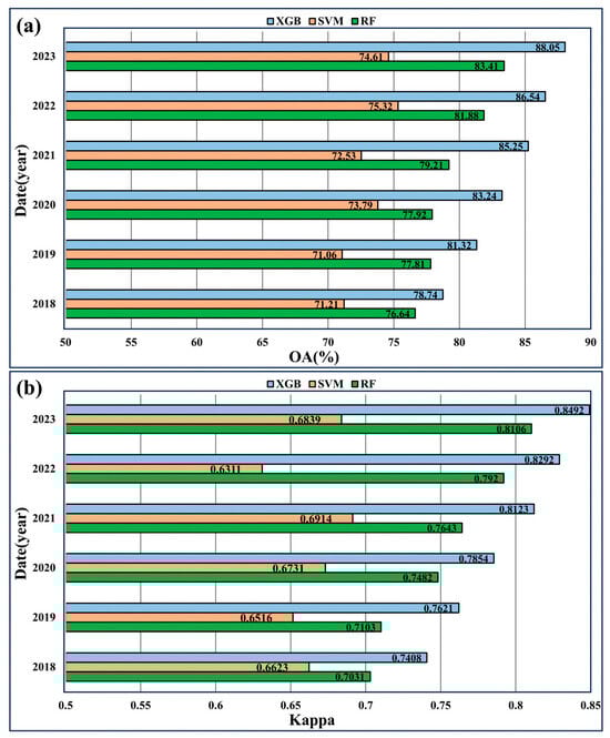 Classification accuracy of each classification model during 2018–2023. (a) represents the overall accuracy, and (b) represents the Kappa coefficient.