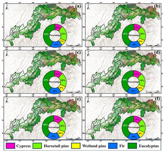 Using each classification model based on the XGB algorithm to predict the forest species in the study area from 2018 to 2023, we obtained the distribution maps of forest dominant species in the study area (Figure 8). As we can see in the figure, Eucalyptus has the widest distribution in the study area, accounting for more than 40% of the total forest area, with a maximum of 44% in 2018, and generally showing a slight decreasing trend during the study period. Spatially, eucalypts are mainly distributed in the central and southwestern parts of the study area. It is followed by horsetail pine, mainly in the north and north-west. Fir is mainly found in the central region. Finally, cypress and wetland pine are mainly found in the southern and northeastern parts of the study area. The distribution of forest-dominant species in the study area was relatively stable from 2018 to 2023, benefitting from the government’s strict forest protection policy.