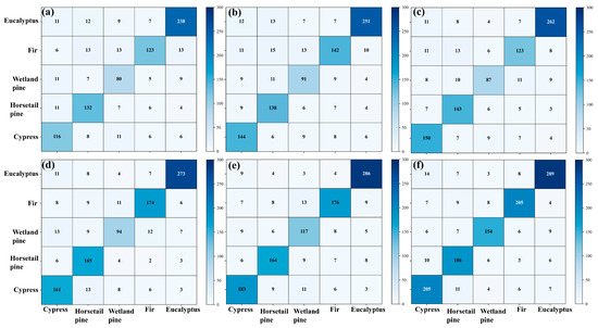 In the classification results, the classification accuracy of each tree species appeared to be quite different (e.g., Figure 9), with eucalyptus obtaining the highest PA and UA, which exceeded 85% in all years (it has the producer accuracy of 88–94% and the user accuracy of 85–94%). On the other hand, wetland pine showed more classification errors, which was the main source of error limiting the overall accuracy. In 2018–2023, wetland pine had a producer accuracy of 66–88% and a user accuracy of 69–84%. Its misclassification is mainly related to cypress and fir. This may be due to the mixed planting of these species in the study area. The rest of the tree species showed better classification accuracy (the producer accuracy of 72–88% and the user accuracy of 78–91%). As can be seen from Figure 10, the samples at the diagonal have an absolute numerical advantage. This represents that misclassification phenomena occur less frequently in the accuracy validation of our classification model. On the whole, our classification model shows excellent performance in the tree species classification task, and the finally obtained forest dominant species map has strong scientific significance.
