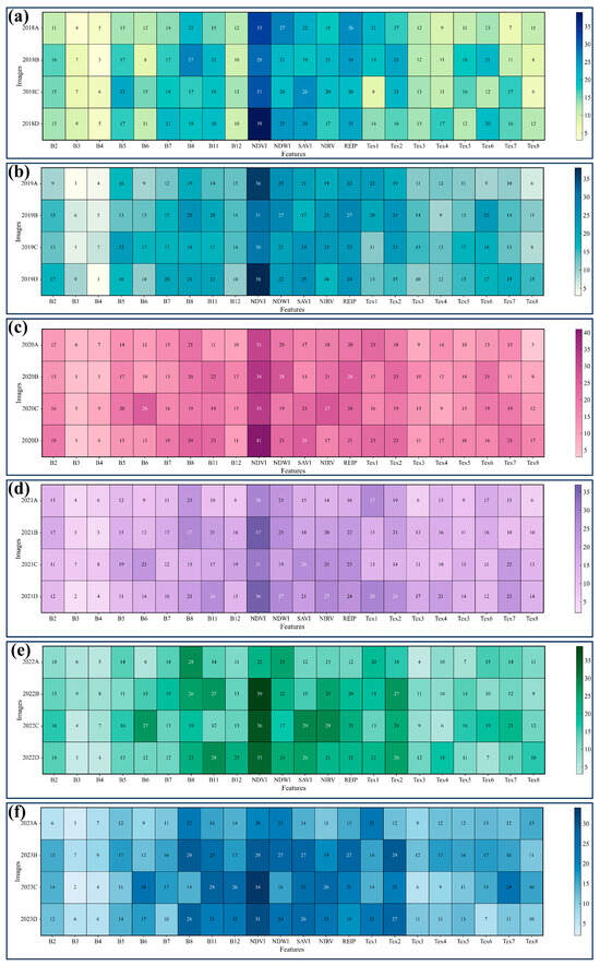 The feature importance of each classified feature in 2018–2023. (a–f) represent the feature importance of the categorical features in sequence during 2018–2023. A–D in the Y-axis labels represent the synthetic remote sensing images in each season. Tex1-8 in the X-axis labels represent the following textural features, respectively: energy, entropy, correlation, inverse difference moment, inertia, cluster shade, cluster prominence, and correlation.