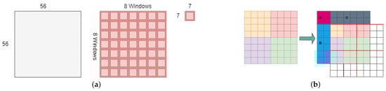 Figure 3. Example operation diagram. (a) is W-MSA, (b) is SW-MSA. - As shown in Figure 3b, in SW-MSA, the window position in W-MSA is offset by in the x and y directions (for example, Window_size = , then offset by 2 pixels). This is combined with the masked MSA method, and each offset window is calculated independently to improve the ability to capture global information.
