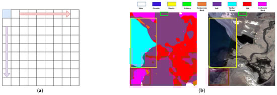 - As shown in Figure 5a, crop GERS data in a top-to-bottom, left-to-right, non-overlapping window sliding manner, and the cropping size was set to in consideration of the high-spatial resolution of Gaofen-2, while the cropping size of Landsat-8 data was set to .