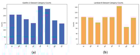 During the entire annotation process, geographical coordinates were used to ensure the consistency of the cropping position and the label data, thereby constructing the Gaofen-2 scene dataset containing geographical coordinates, with a total of 1668 images. Meanwhile, the same annotation process was followed for the GERS image in Figure 1 to produce the Landsat-8 scene dataset, totaling 899 images. Figure 6 presents a partial sample of the two datasets, while Table 2 details the number of images in each GERS element class. Figure 7 shows the distribution of the quantity of images in each category in the two datasets in the form of histograms.