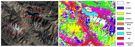 Finally, we use the model weight with OA = 80.23% and scale it at the same ratio to predict the wider Landsat-8 entire image. As shown in Figure 9, the outlines of each GERS element were accurately identified and the boundaries of water bodies, soil distribution patterns, and the spatial distribution of rocks such as diorite, gabbro, and granite were successfully depicted. However, as in Figure 8, there is still a large amount of “salt and pepper” misclassification in the surface water interpretation.