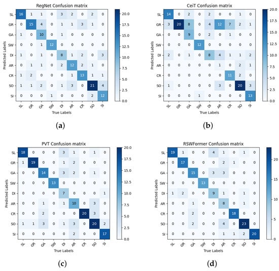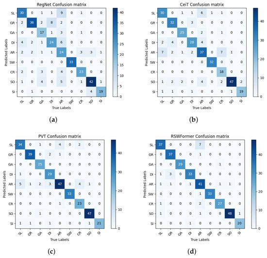 Confusion matrix of Landsat-8 dataset, (a) is RegNet and OA = 67.23%, (b) is CeiT and OA = 62.71%, (c) is PVT and OA = 78.53%, (d) is RSWFormer and OA = 80.23%.