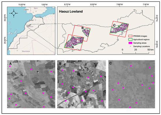 Location of the study sites in southern Morocco within the Haouz plain. PRISMA images used to cover the three investigated areas: (A) Mejjat; (B) West N’fis; and (C) Central Haouz.