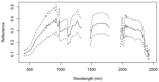 To link the PRISMA reflectance information from each of the 803 locations to the ISDA soil map, the same 3 × 3 buffer was used to create a soil spectral information dataset from each of the three hyperspectral images. The resulting mean of the spectral signatures of the 803 samples (i.e., black curve) are shown in Figure 3 together with their variability (i.e., ±SD).