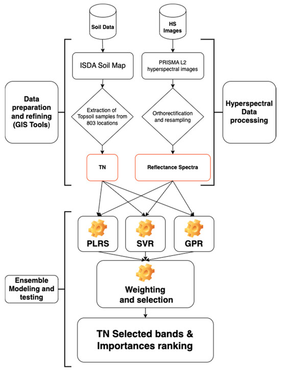 Diagram illustrating the datasets that were used and the ensemble method that was used to create the relationship between the soil TN dataset and the PRISMA hyperspectral photography dataset. Three learners made up the ensemble method: PLSR (partial least square regression), SVR (support vector regression), and GPR (Gaussian process regression).