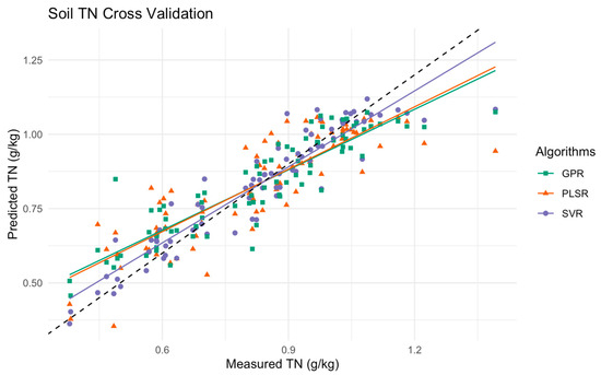 Scatter plot of measured versus predicted soil TN levels using PLSR, SVR, and GPR models in the multimethod ensemble. This plot represents data that resulted in one-fold from a 10-fold cross-validation, with the black dashed line indicating the ideal 1:1 relationship between measured and predicted values.