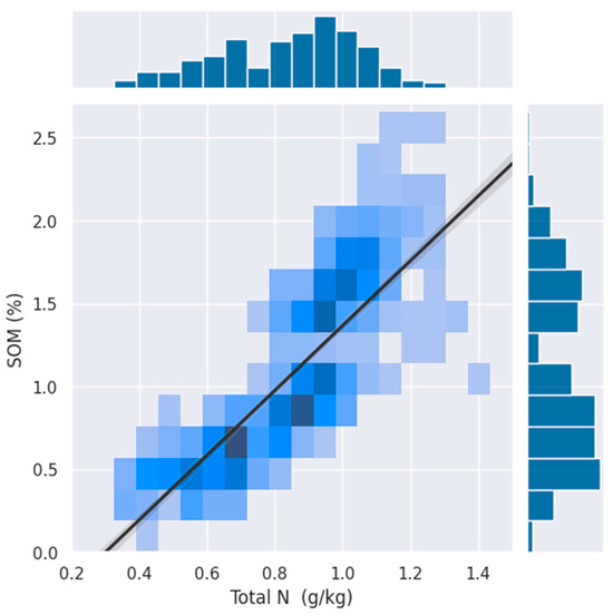 Relationship between the percentage of the total nitrogen (TN) content (g/kg) and soil organic matter (SOM) in soil samples. The density of the points is indicated by the color intensity, with darker shades of blue representing higher densities of observations. A strong positive correlation is observed, as illustrated by the trend line, suggesting that higher levels of organic matter are associated with an increased total nitrogen content.