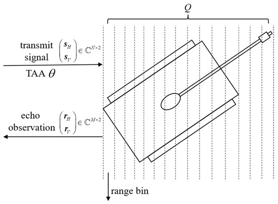 Considering that the range cell number of the TIRM is Q, and that observations are collected over M discrete intervals, where , so that the entire echo of the extended target can be fully received in a single sample, a schematic diagram of a fully polarized radar detecting a tank target is given in Figure 2.