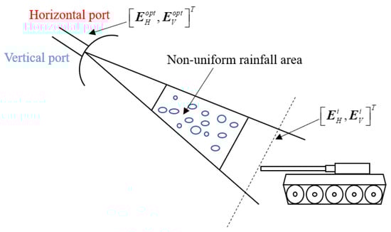 where is the wave number in free space, which depends on the radar operating frequency. and denote the composite wave numbers of horizontal polarization and vertical polarization, respectively, and r is the radial distance of the rain zone (it is assumed that the radial distance of the rain zone is much larger than the height of the radar antenna erection). By the above derivation, we obtain the nonuniform rain area transmission matrix .