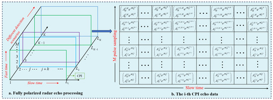 In practice, fully polarized radar requires different echo processing for different detection scenarios, so different transmit signal and receive filters are used for each coherent processing interval(CPI). L pulse acquisition times constitutes a CPI, and a single pulse transmit signal is sampled by M times for digital processing at the receiving end. The specific process is shown in Figure 4. Figure 4a represents the radar processing in different detection scenarios. Each column of Figure 4b represents the sampling data of one pulse and the L pulse forms a CPI.
